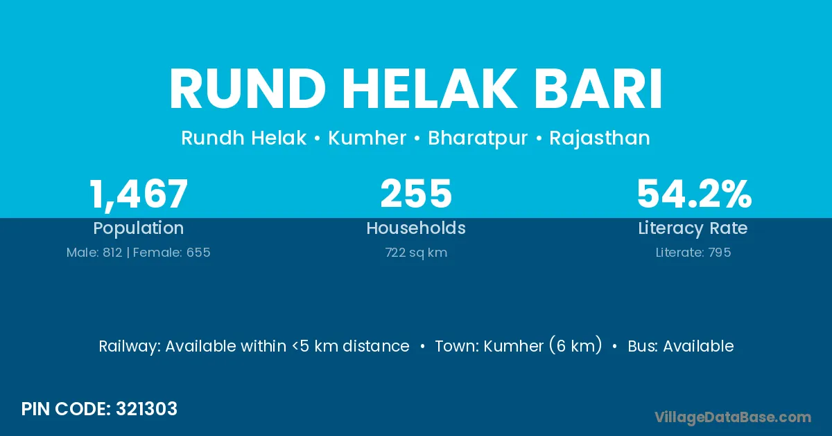 Kumher (6 km) is the nearest town to Rund Helak Bari village for major economic activities and is located approximately 6 km away.