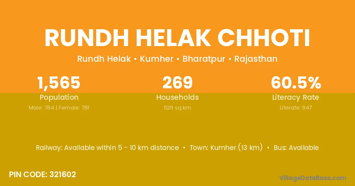 Kumher (13 km) is the nearest town to Rundh Helak Chhoti village for major economic activities and is located approximately 13 km away.