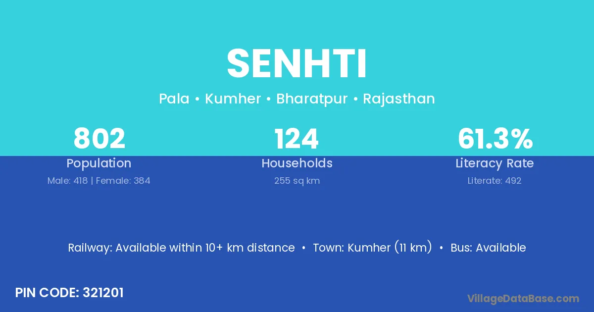 Kumher (11 km) is the nearest town to Senhti village for major economic activities and is located approximately 11 km away.