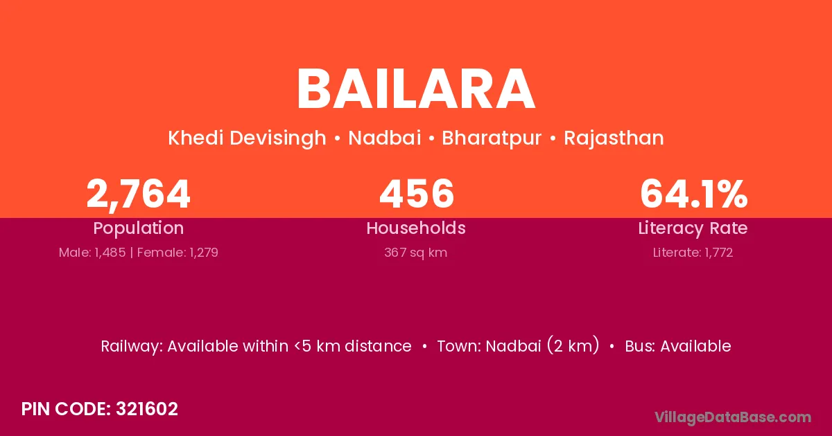 Nadbai (2 km) is the nearest town to Bailara village for major economic activities and is located approximately 2 km away.