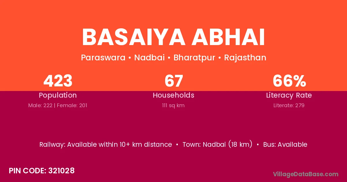 Nadbai (18 km) is the nearest town to Basaiya Abhai village for major economic activities and is located approximately 18 km away.
