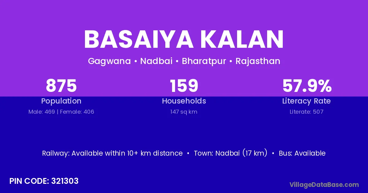 Nadbai (17 km) is the nearest town to Basaiya Kalan village for major economic activities and is located approximately 17 km away.