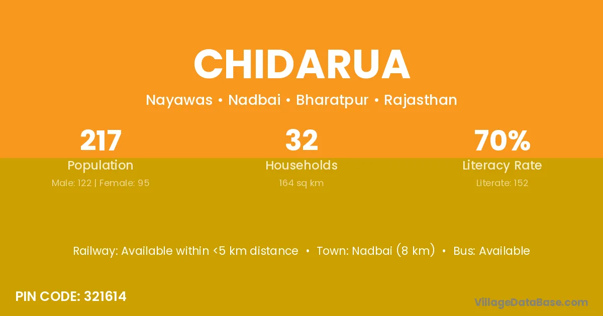 Nadbai (8 km) is the nearest town to Chidarua village for major economic activities and is located approximately 8 km away.