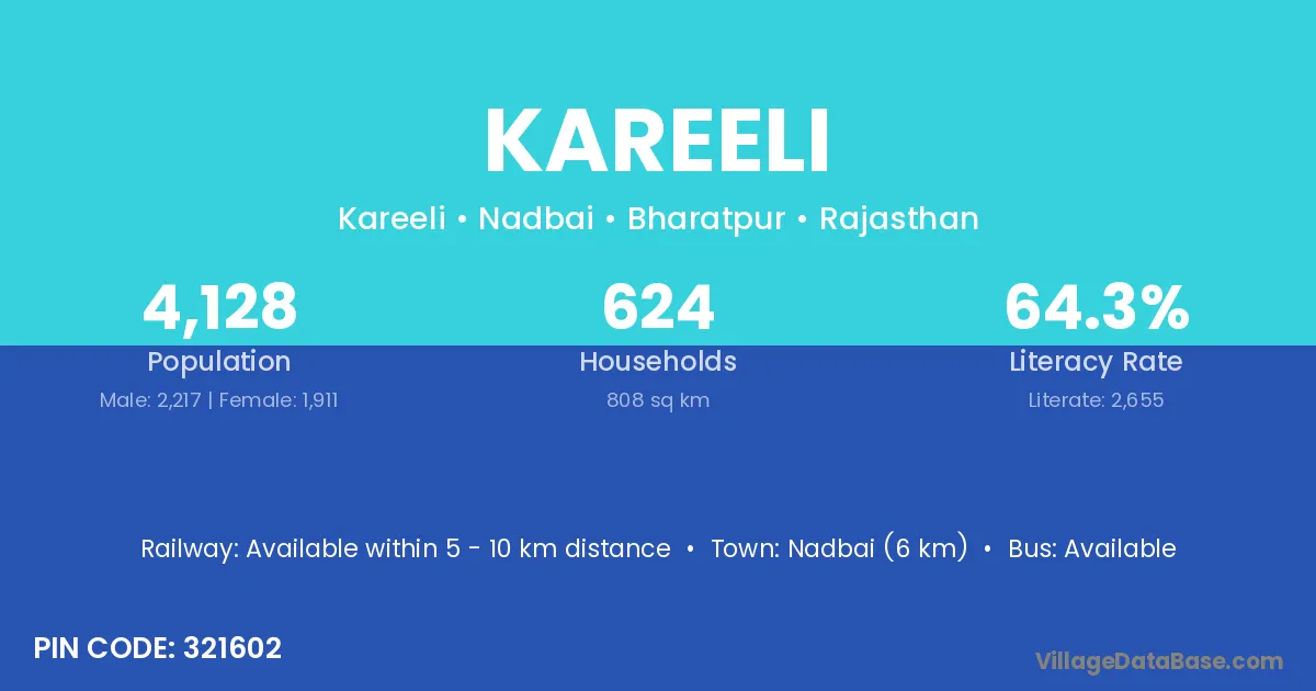 Nadbai (6 km) is the nearest town to Kareeli village for major economic activities and is located approximately 6 km away.