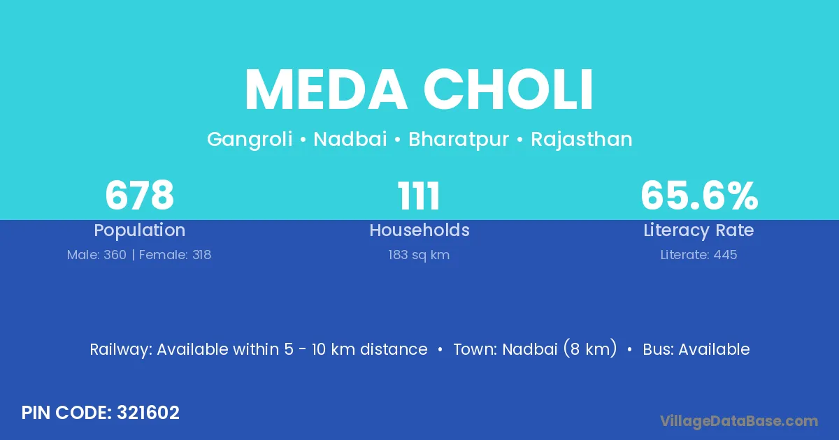 Nadbai (8 km) is the nearest town to Meda Choli village for major economic activities and is located approximately 8 km away.