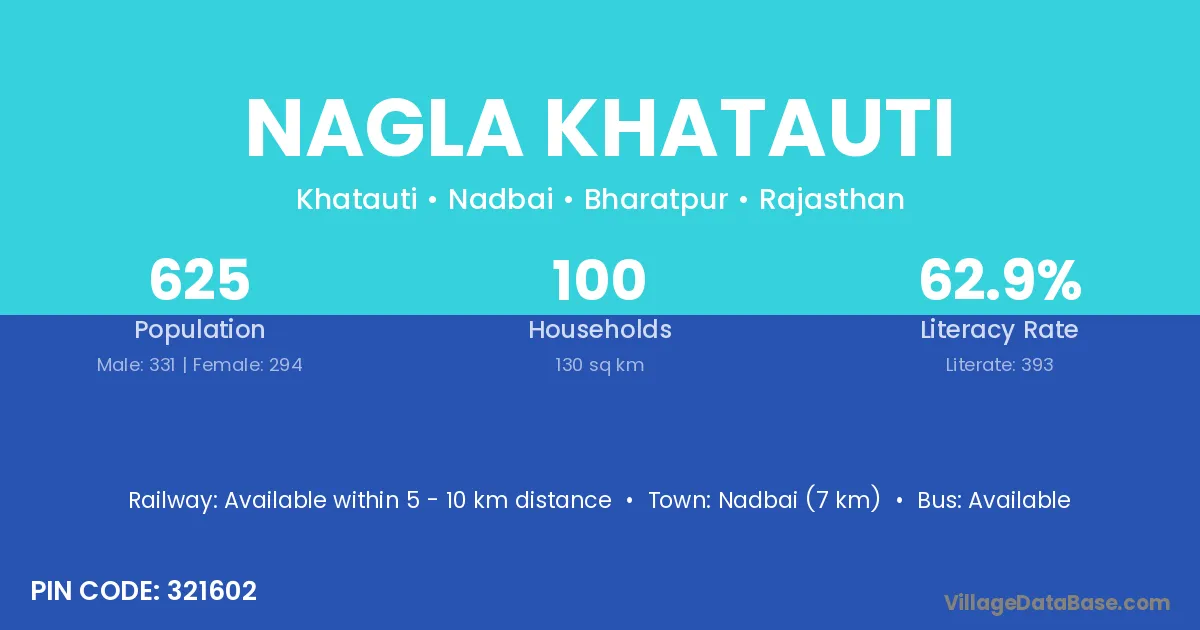 Nadbai (7 km) is the nearest town to Nagla Khatauti village for major economic activities and is located approximately 7 km away.