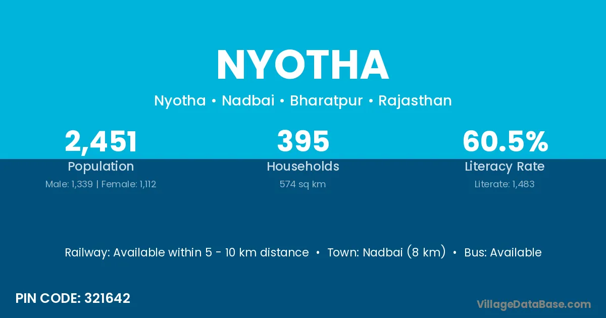 Nadbai (8 km) is the nearest town to Nyotha village for major economic activities and is located approximately 8 km away.