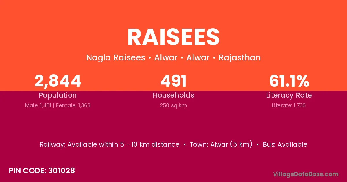 Nadbai (6 km) is the nearest town to Raisees village for major economic activities and is located approximately 6 km away.