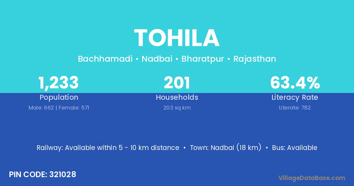 Nadbai (18 km) is the nearest town to Tohila village for major economic activities and is located approximately 18 km away.