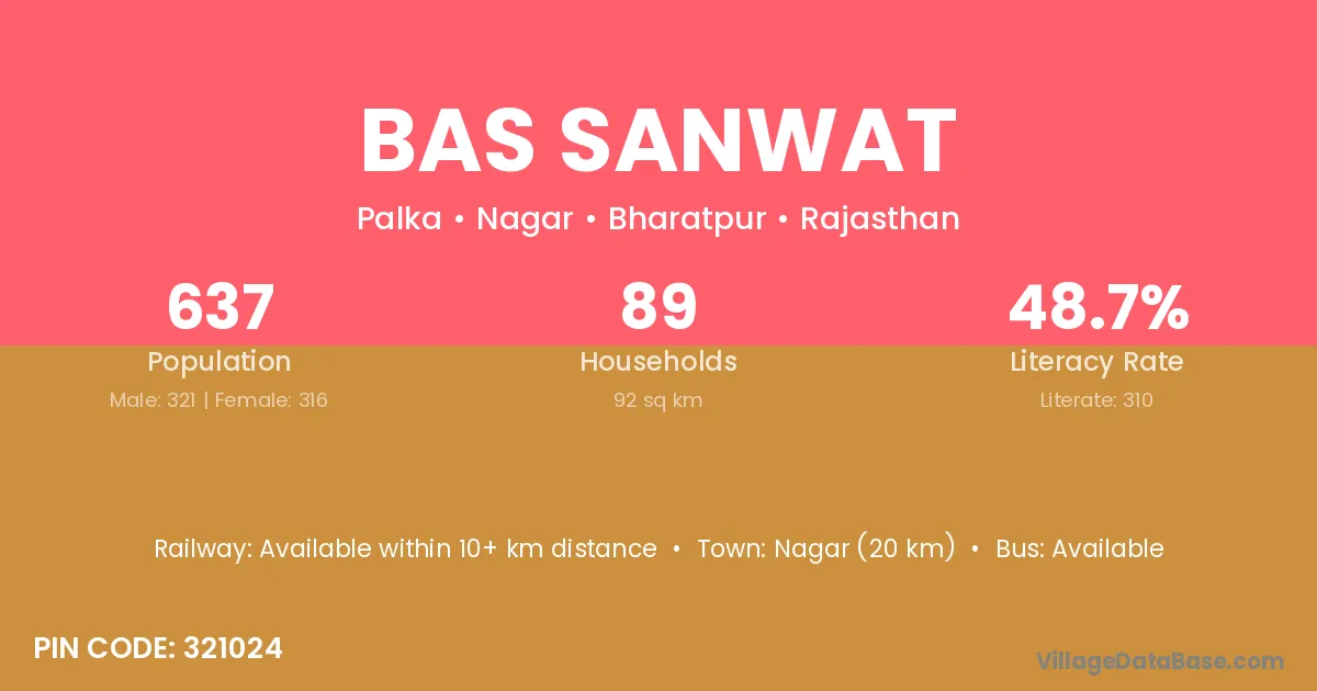 Nagar (20 km) is the nearest town to Bas Sanwat village for major economic activities and is located approximately 20 km away.