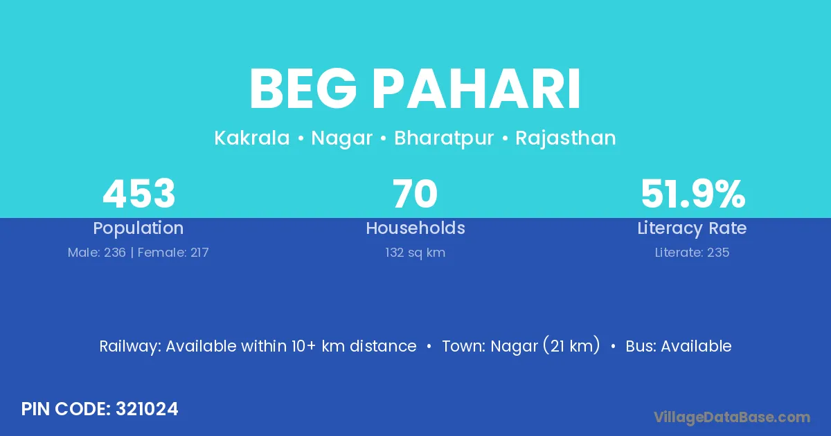 Beg Pahari village has a total population of 453 people, of which 236 are males and 217 are females.