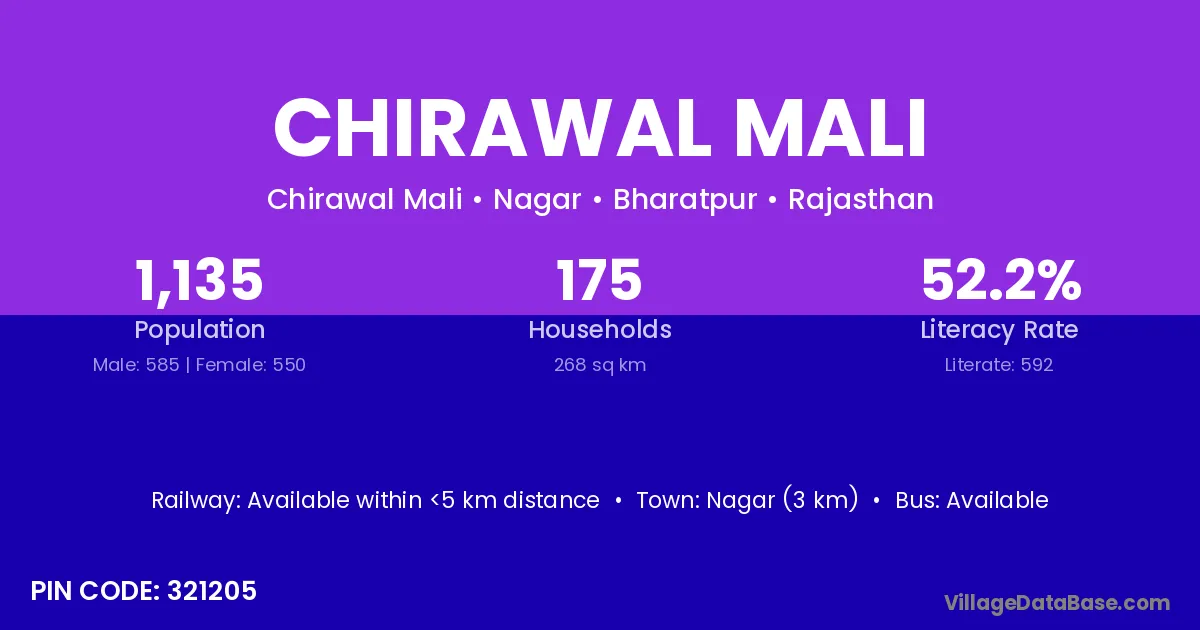Nagar (3 km) is the nearest town to Chirawal Mali village for major economic activities and is located approximately 3 km away.