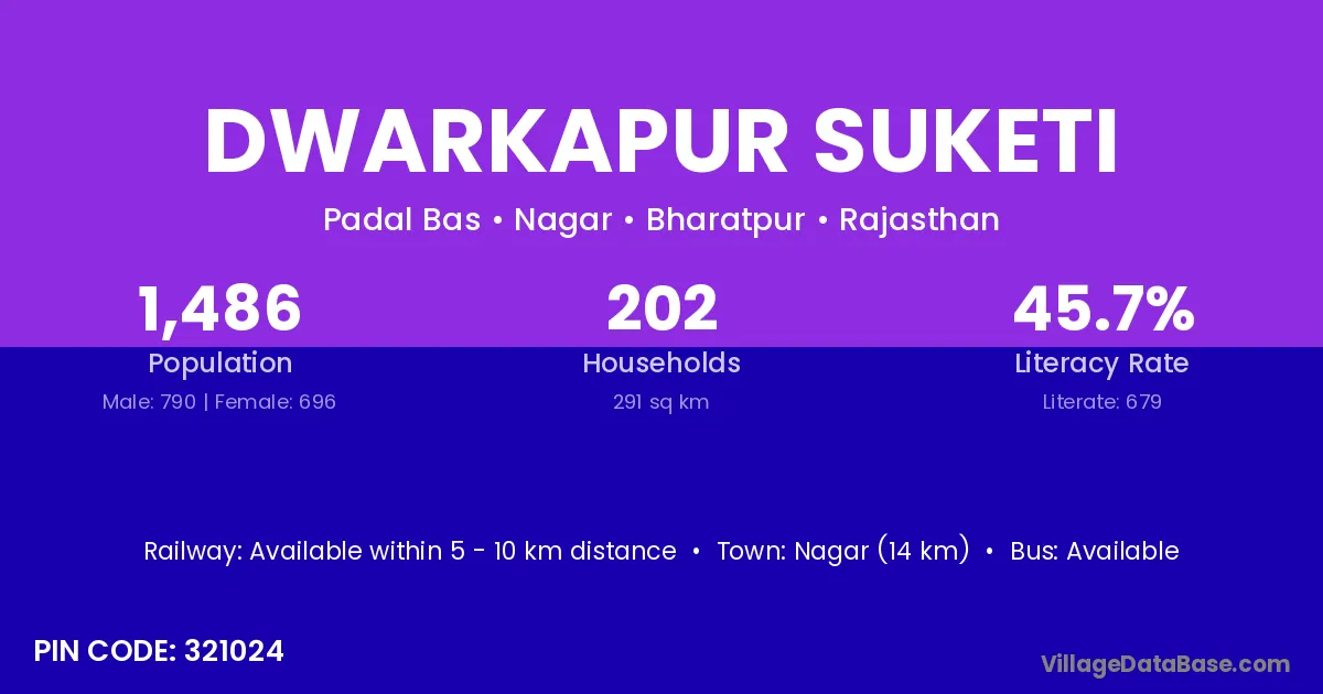 Nagar (14 km) is the nearest town to Dwarkapur Suketi village for major economic activities and is located approximately 14 km away.
