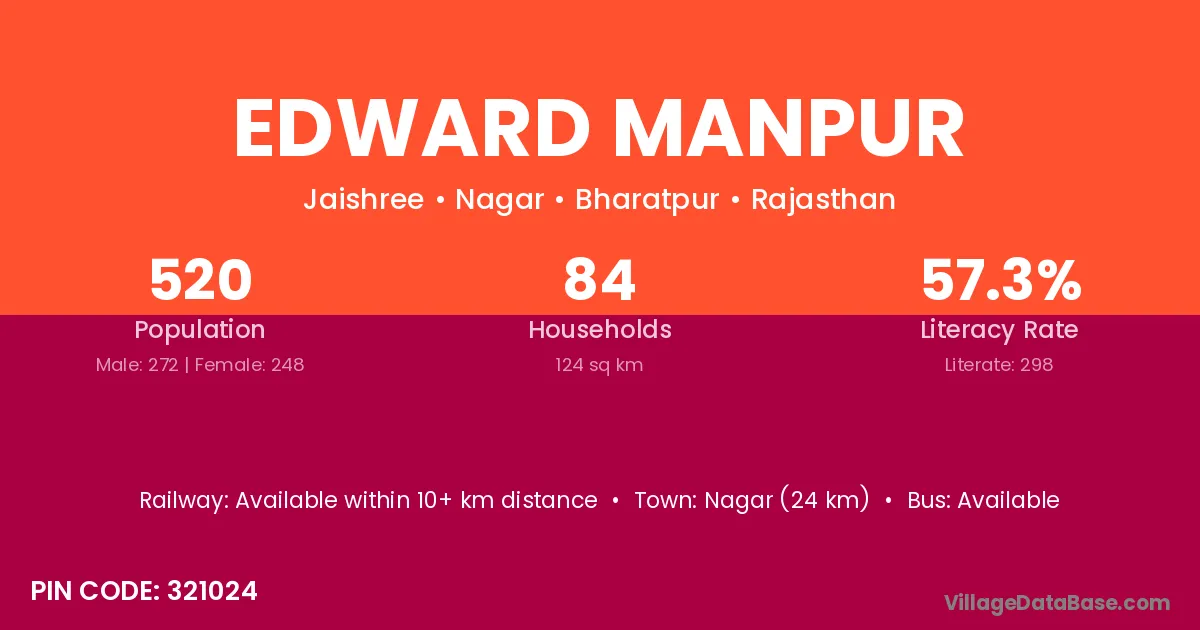 Nagar (24 km) is the nearest town to Edward Manpur village for major economic activities and is located approximately 24 km away.