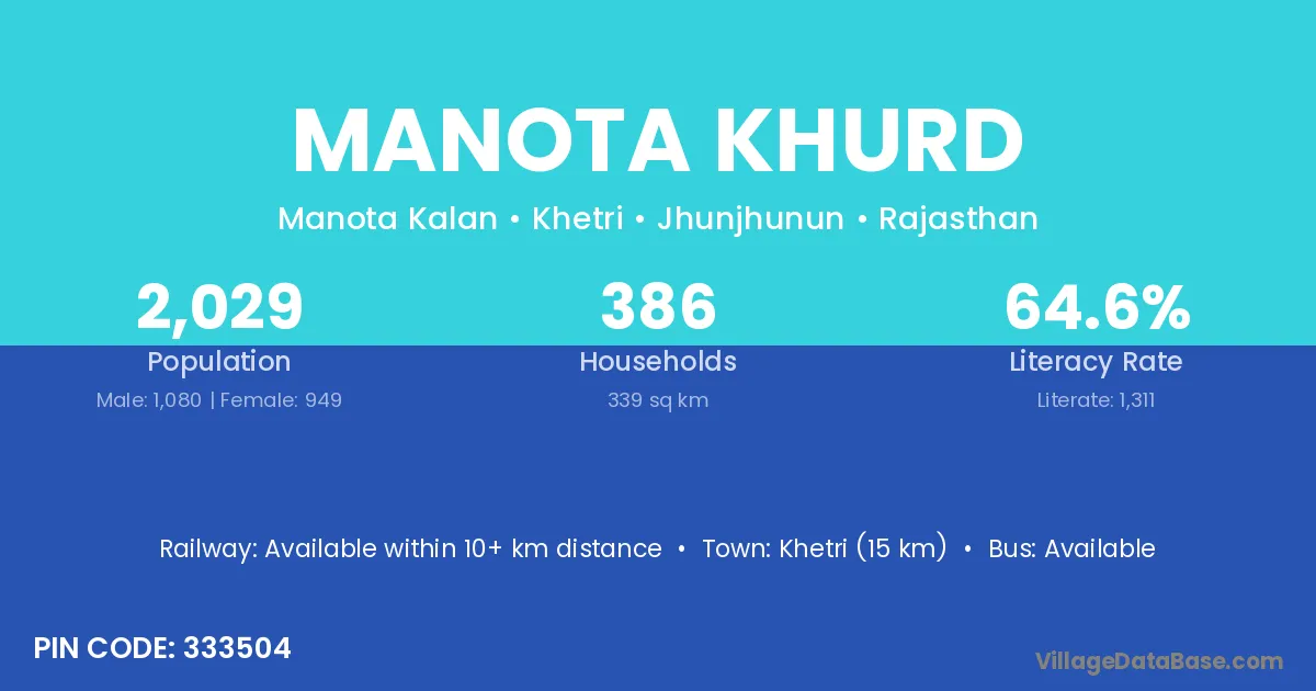 Nagar (14 km) is the nearest town to Manota Khurd village for major economic activities and is located approximately 14 km away.