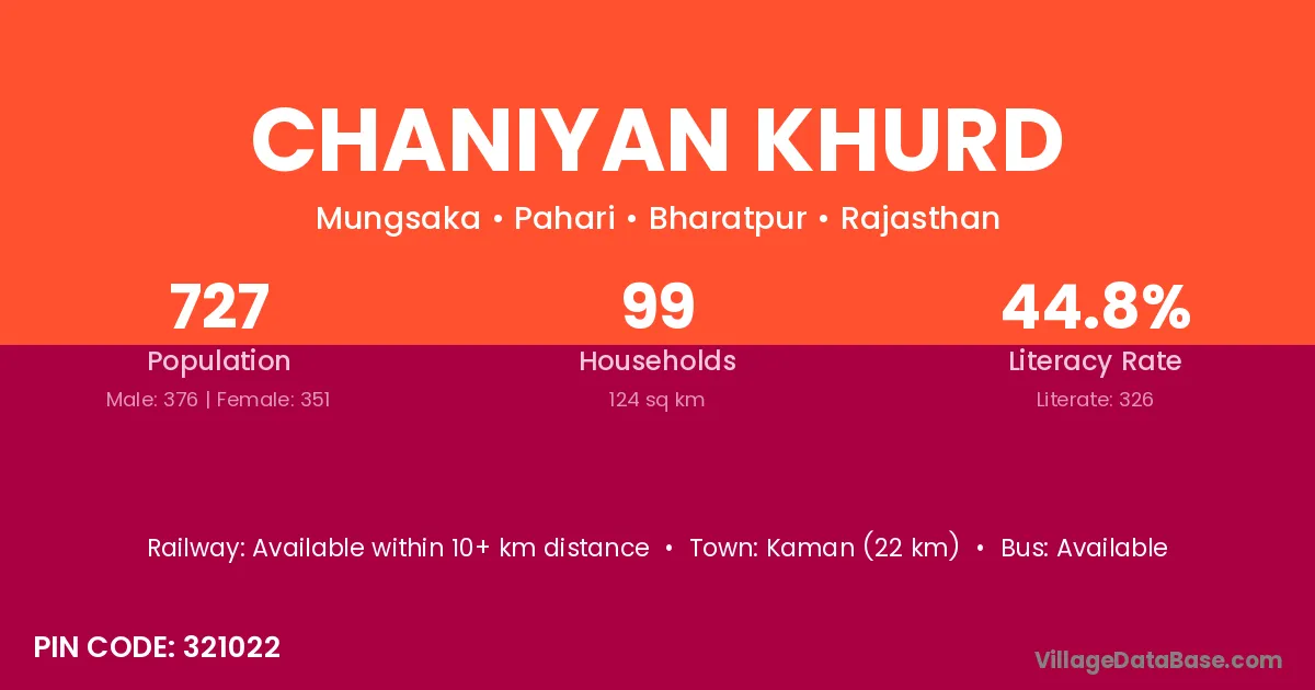 Kaman (22 km) is the nearest town to Chaniyan Khurd village for major economic activities and is located approximately 22 km away.