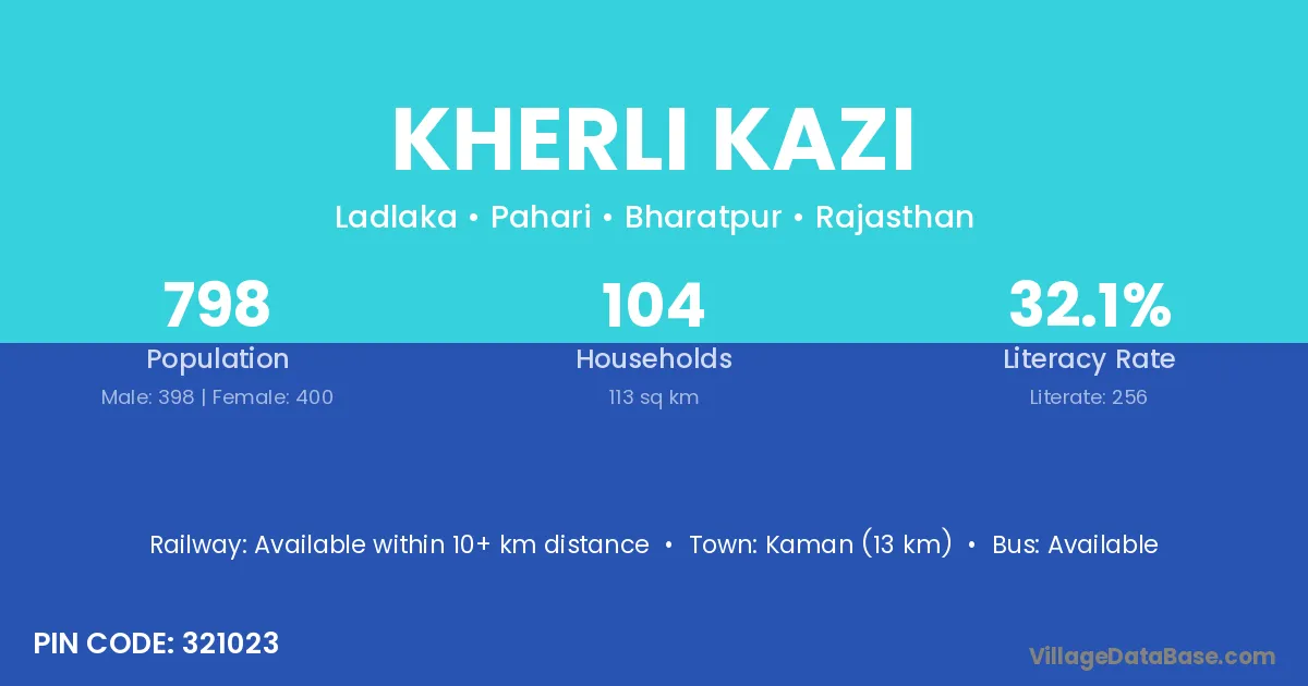 Kaman (13 km) is the nearest town to Kherli Kazi village for major economic activities and is located approximately 13 km away.
