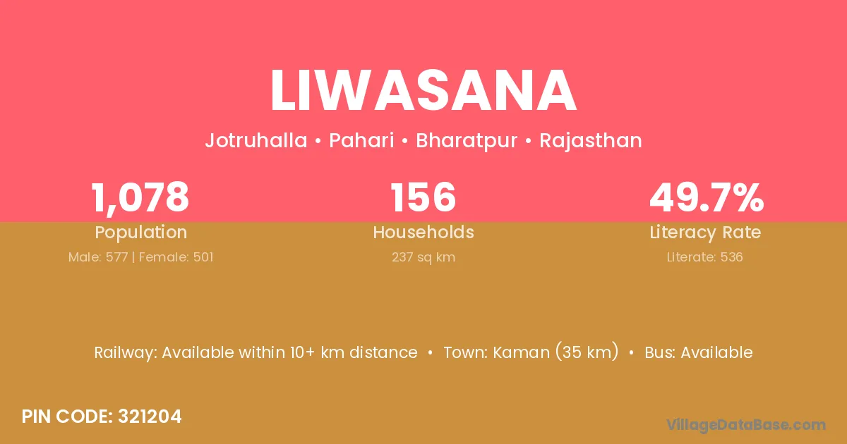 Kaman (35 km) is the nearest town to Liwasana village for major economic activities and is located approximately 35 km away.