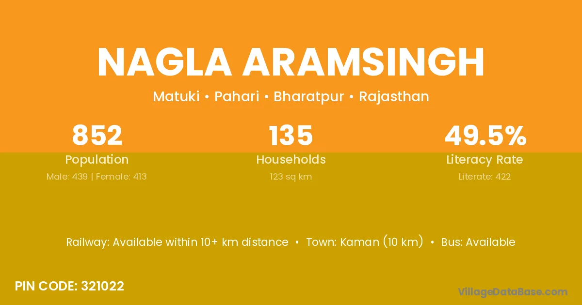 Kaman (10 km) is the nearest town to Nagla Aramsingh village for major economic activities and is located approximately 10 km away.