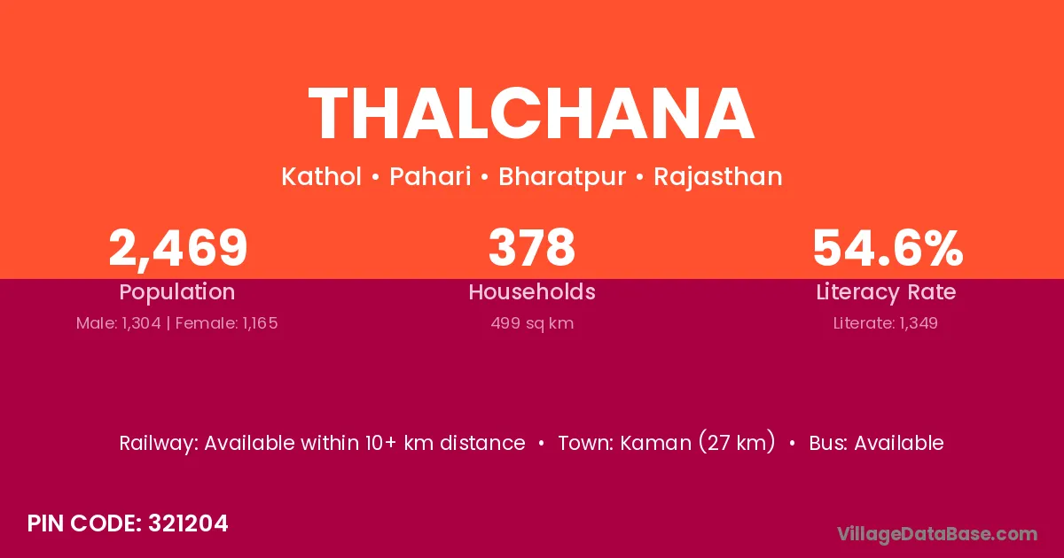Kaman (27 km) is the nearest town to Thalchana village for major economic activities and is located approximately 27 km away.