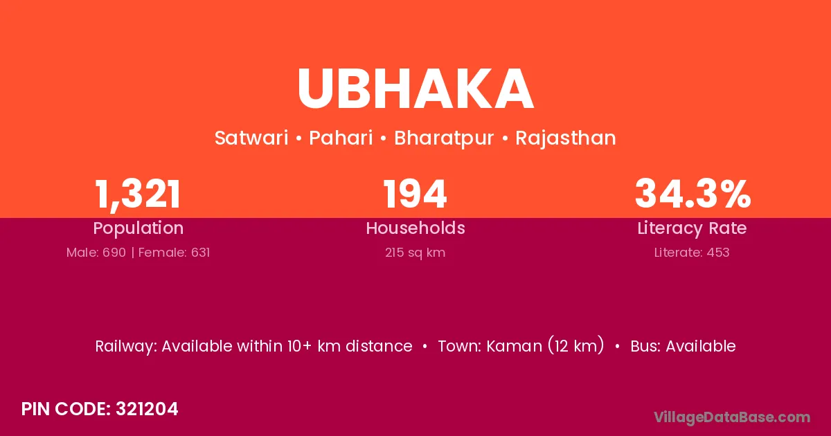 Kaman (12 km) is the nearest town to Ubhaka village for major economic activities and is located approximately 12 km away.