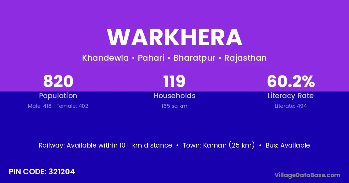 Kaman (25 km) is the nearest town to Warkhera village for major economic activities and is located approximately 25 km away.