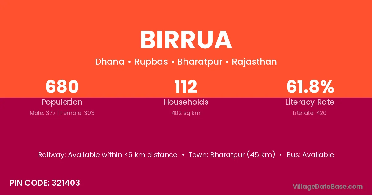 Bharatpur (45 km) is the nearest town to Birrua village for major economic activities and is located approximately 45 km away.