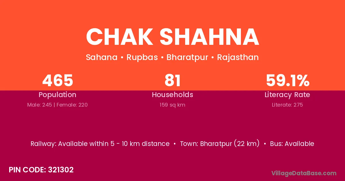 Bharatpur (22 km) is the nearest town to Chak Shahna village for major economic activities and is located approximately 22 km away.