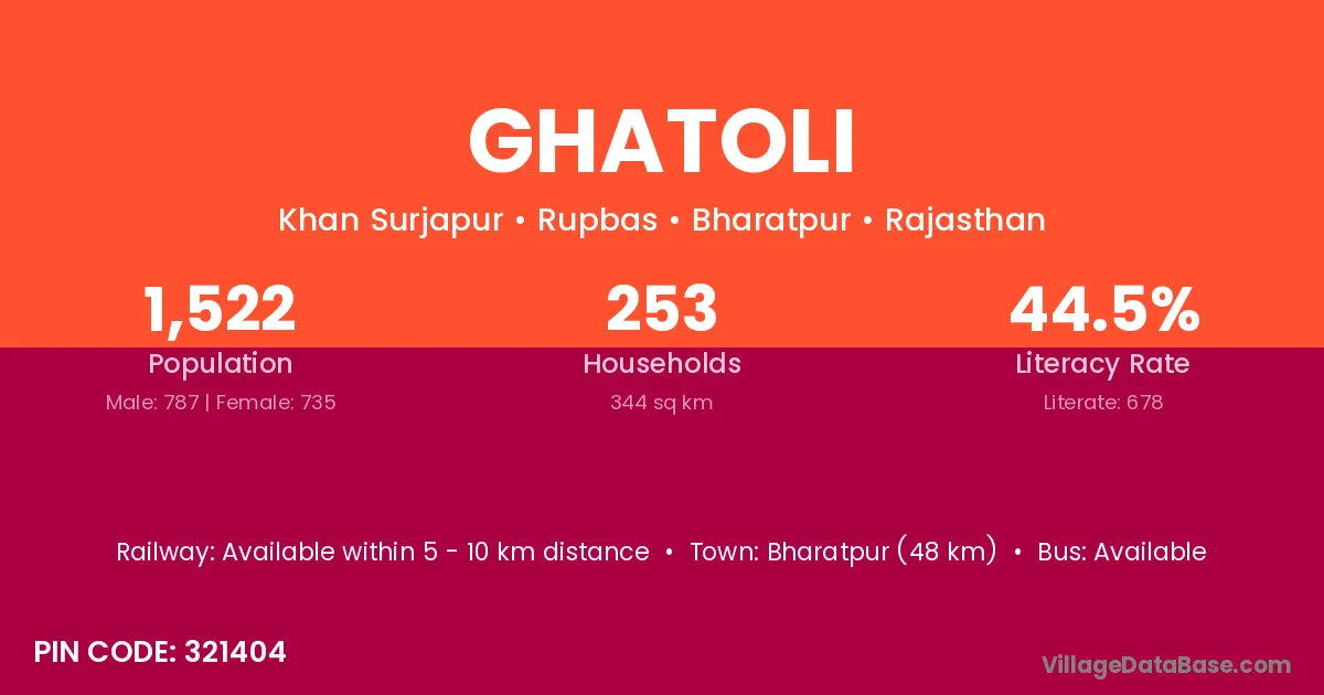 Bharatpur (48 km) is the nearest town to Ghatoli village for major economic activities and is located approximately 48 km away.