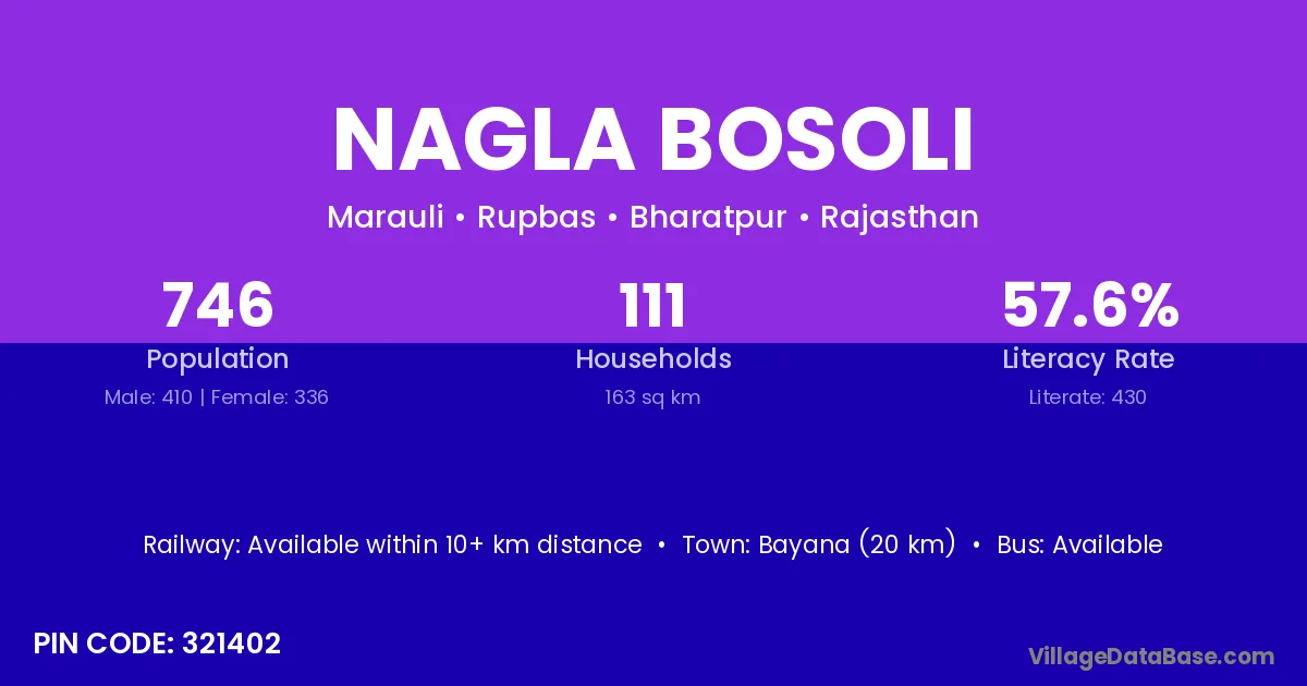 Bayana (20 km) is the nearest town to Nagla Bosoli village for major economic activities and is located approximately 20 km away.