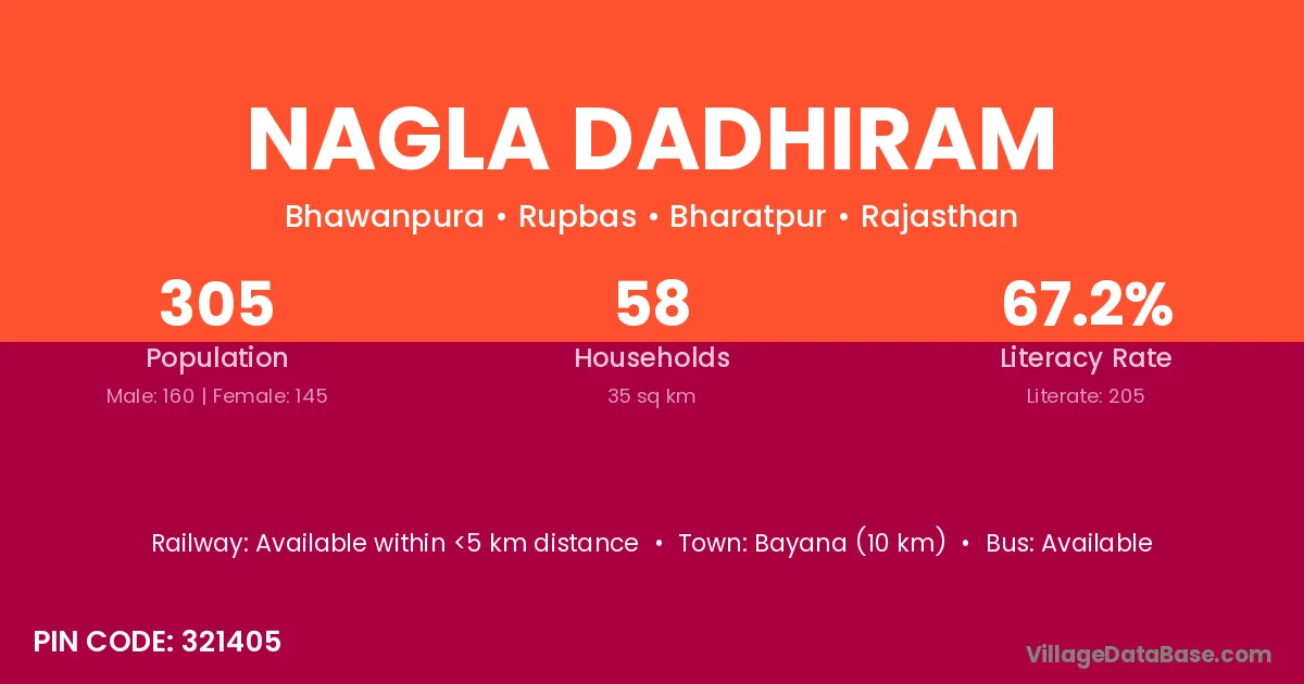 Bayana (10 km) is the nearest town to Nagla Dadhiram village for major economic activities and is located approximately 10 km away.