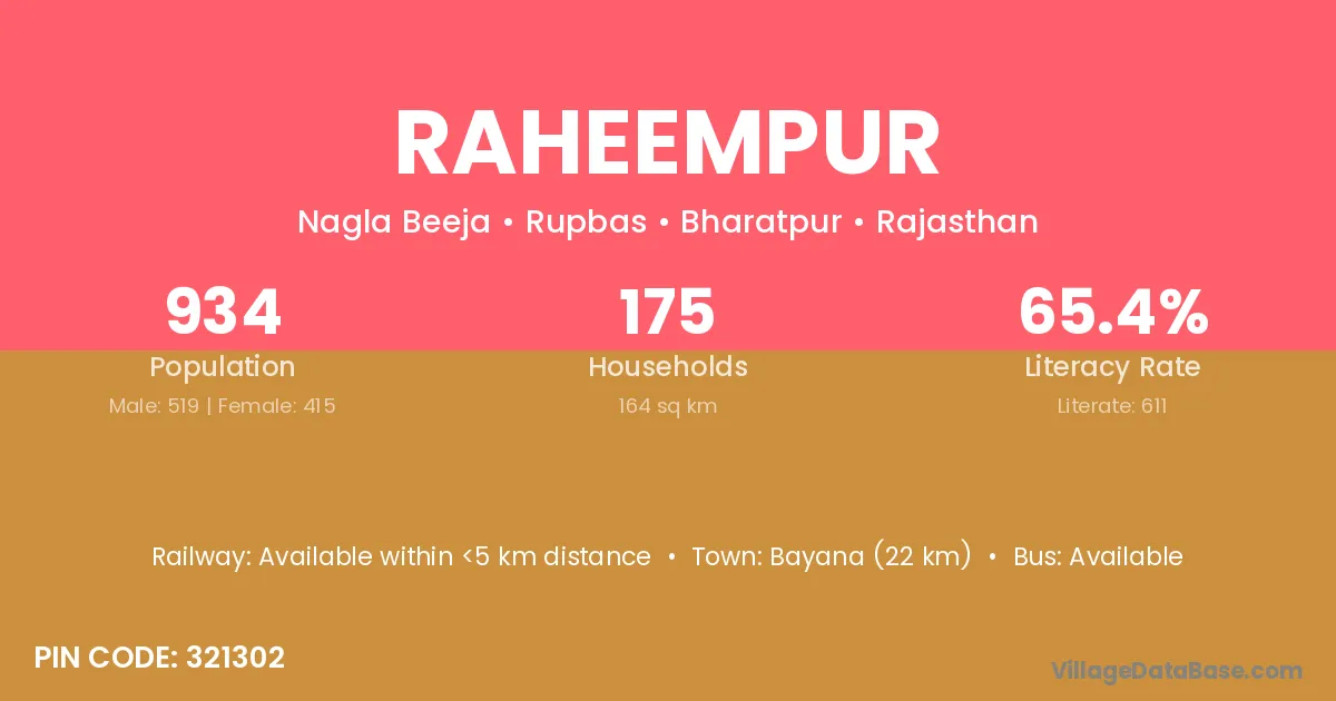 Bayana (22 km) is the nearest town to Raheempur village for major economic activities and is located approximately 22 km away.