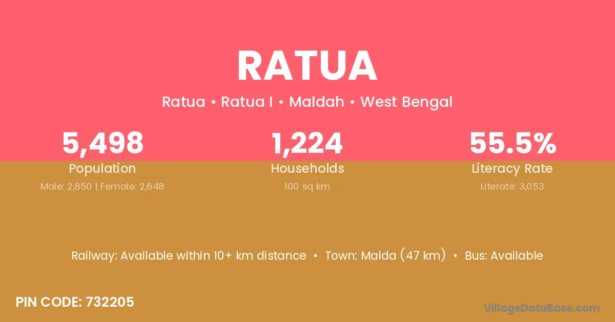 The literacy rate of Ratua village is 55.72%. Male literacy stands at 68.78% and female literacy at 39.29%.