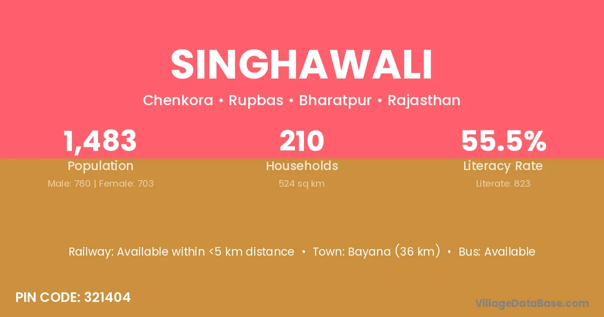 Bayana (36 km) is the nearest town to Singhawali village for major economic activities and is located approximately 36 km away.