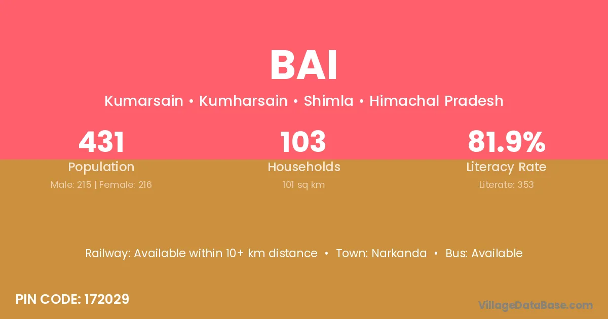 The literacy rate of Bai village is 58.55%. Male literacy stands at 71.45% and female literacy at 44.22%.