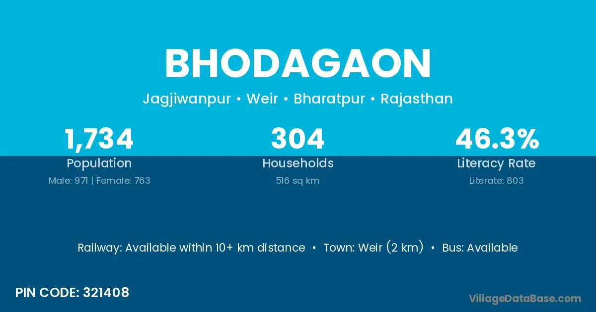 Weir (2 km) is the nearest town to Bhodagaon village for major economic activities and is located approximately 2 km away.