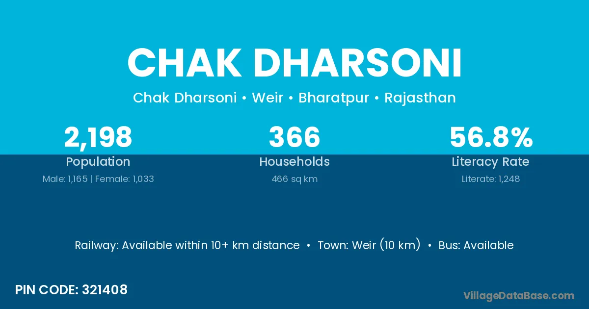 Weir (10 km) is the nearest town to Chak Dharsoni village for major economic activities and is located approximately 10 km away.