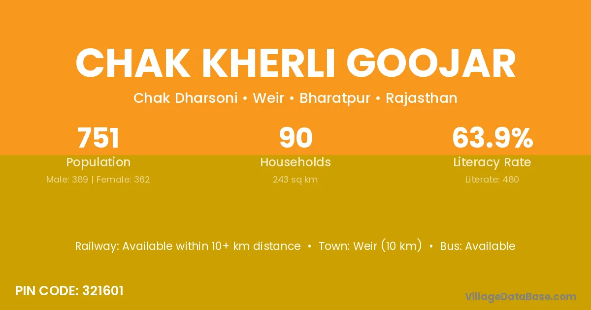 Weir (10 km) is the nearest town to Chak Kherli Goojar village for major economic activities and is located approximately 10 km away.