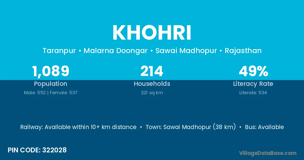 The literacy rate of Khohri village is 48.74%. Male literacy stands at 63.21% and female literacy at 32.26%.
