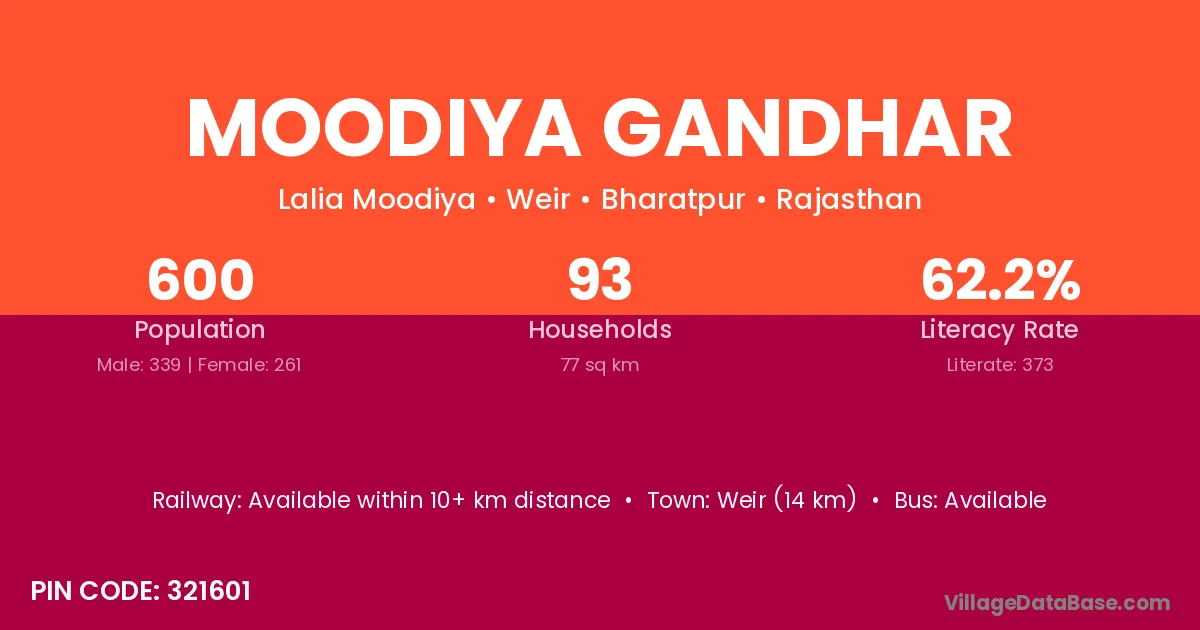 Moodiya Gandhar village has a total population of 600 people, of which 339 are males and 261 are females.