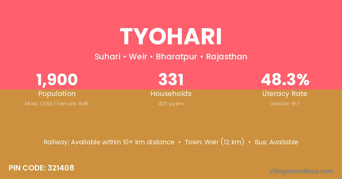 Tyohari village has a total population of 1,900 people, of which 1,052 are males and 848 are females.