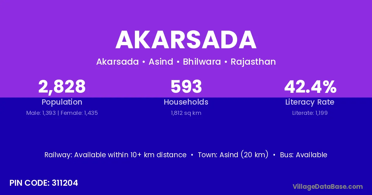 Asind (20 km) is the nearest town to Akarsada village for major economic activities and is located approximately 20 km away.