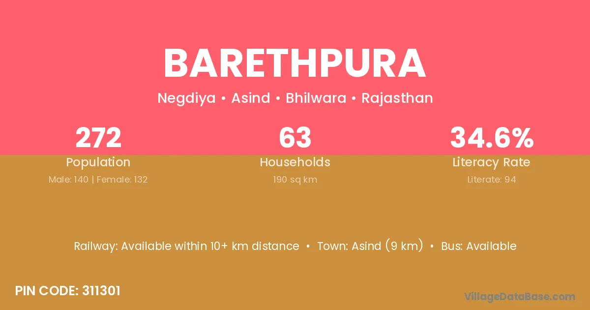 Asind (9 km) is the nearest town to Barethpura village for major economic activities and is located approximately 9 km away.