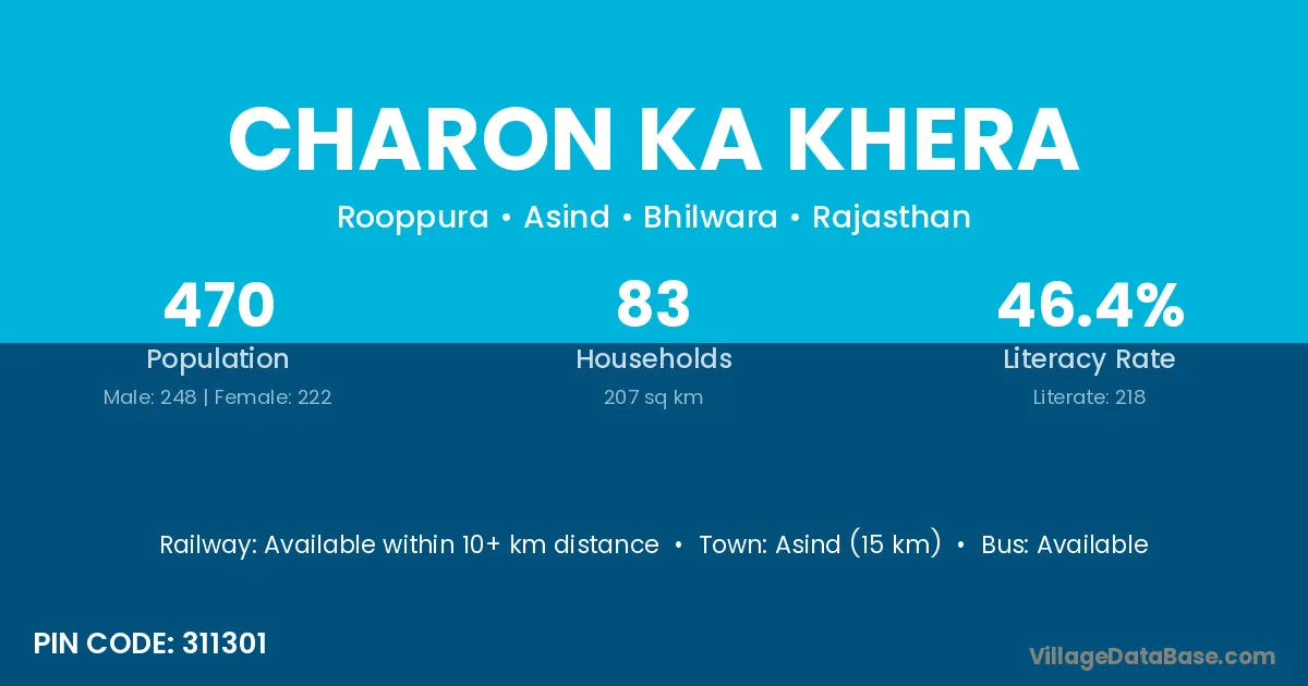 Asind (15 km) is the nearest town to Charon Ka Khera village for major economic activities and is located approximately 15 km away.