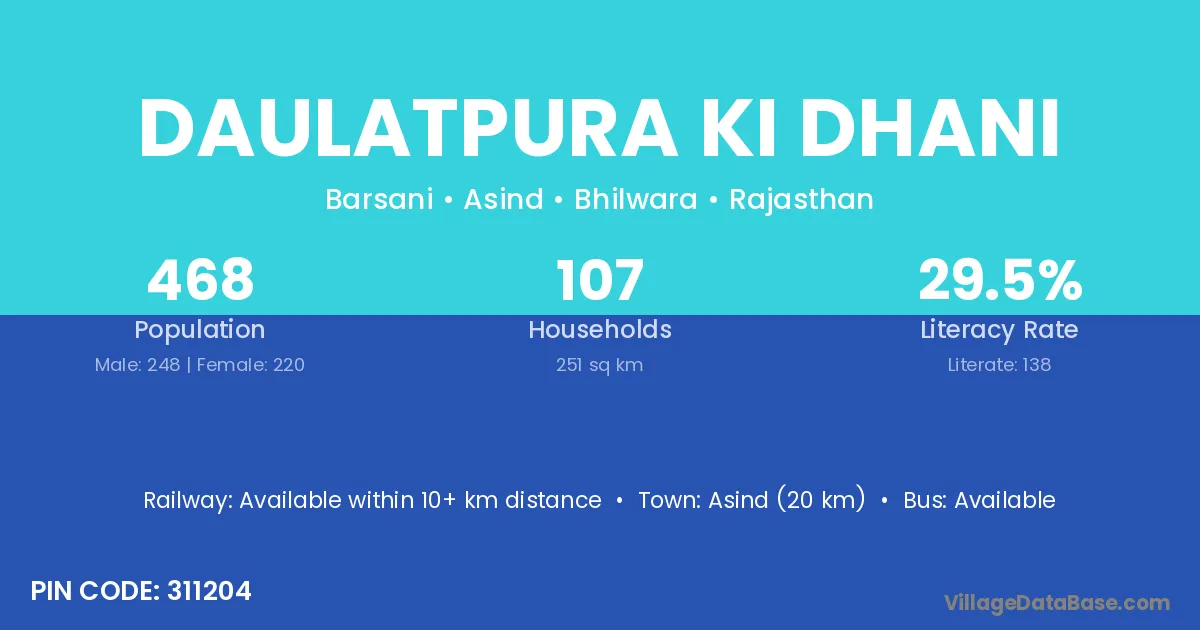 Asind (20 km) is the nearest town to Daulatpura Ki Dhani village for major economic activities and is located approximately 20 km away.
