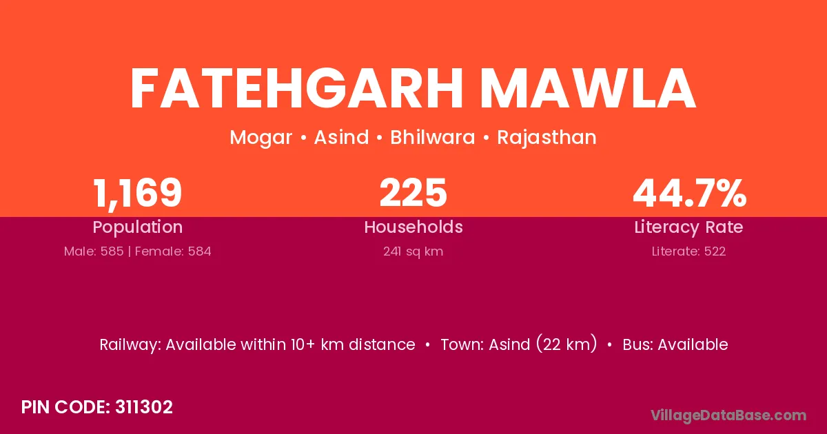 Asind (22 km) is the nearest town to Fatehgarh Mawla village for major economic activities and is located approximately 22 km away.