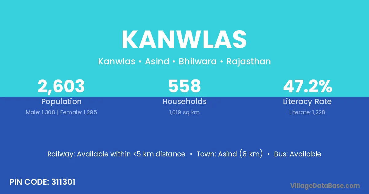 Asind (8 km) is the nearest town to Kanwlas village for major economic activities and is located approximately 8 km away.