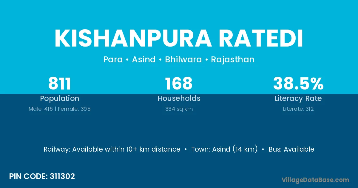 Asind (14 km) is the nearest town to Kishanpura Ratedi village for major economic activities and is located approximately 14 km away.