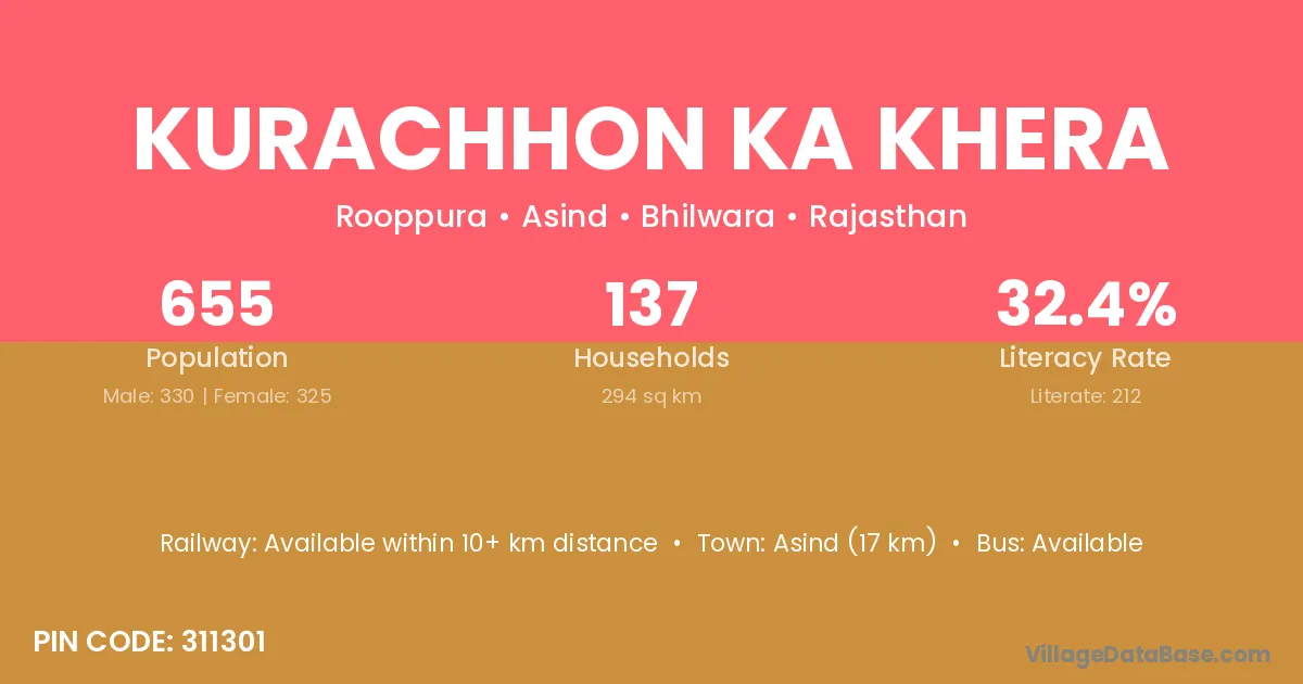 Kurachhon Ka Khera village has a total population of 655 people, of which 330 are males and 325 are females.