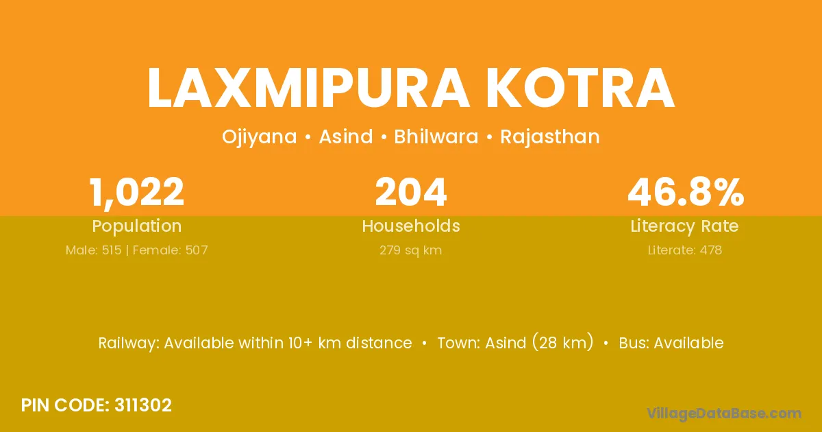Asind (28 km) is the nearest town to Laxmipura Kotra village for major economic activities and is located approximately 28 km away.
